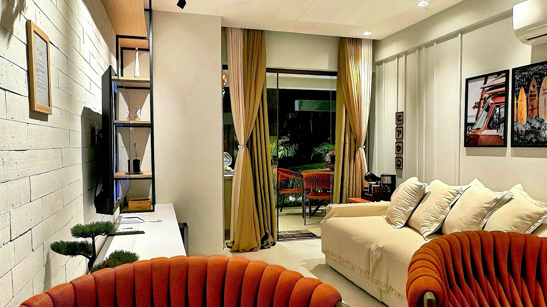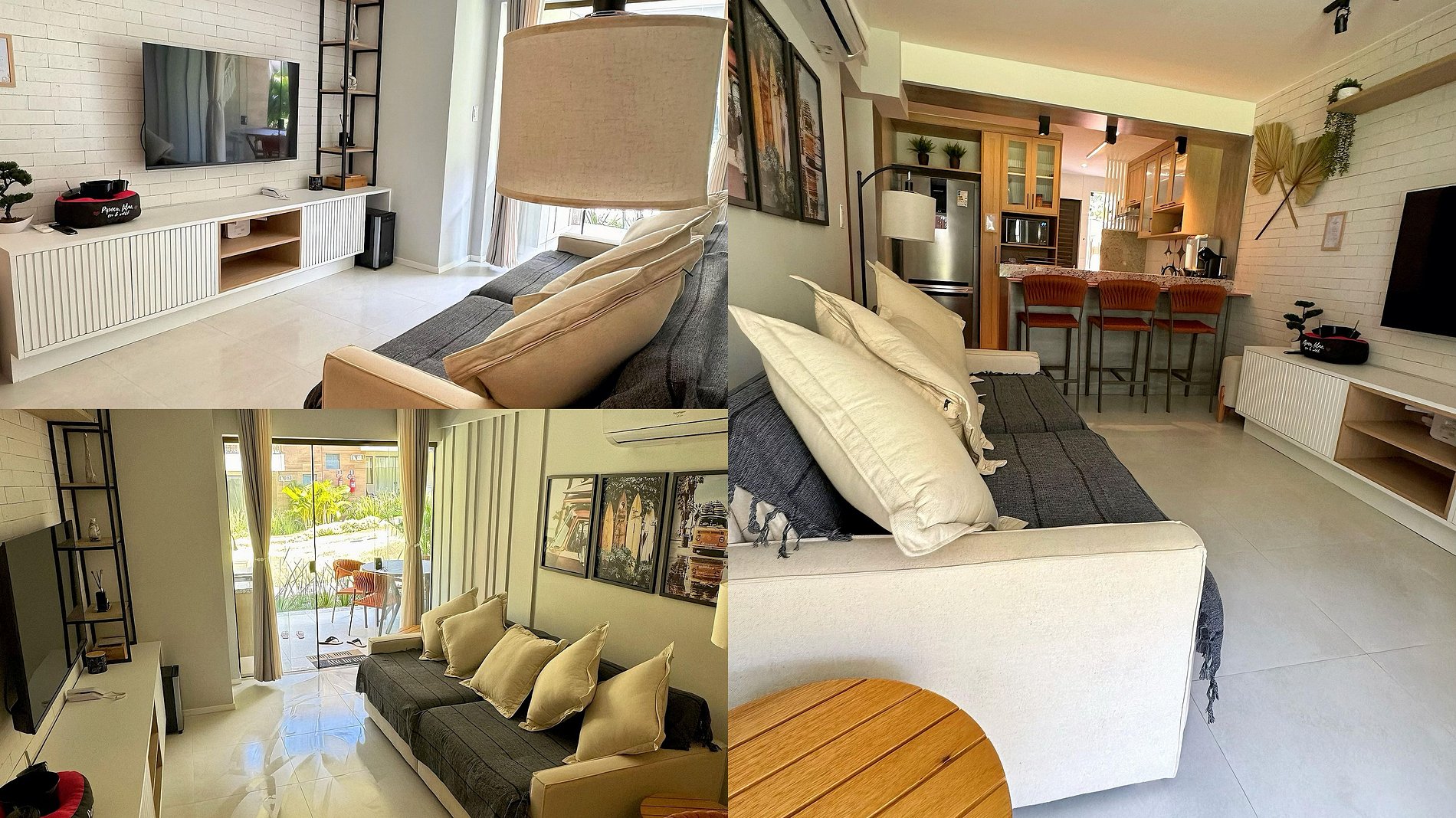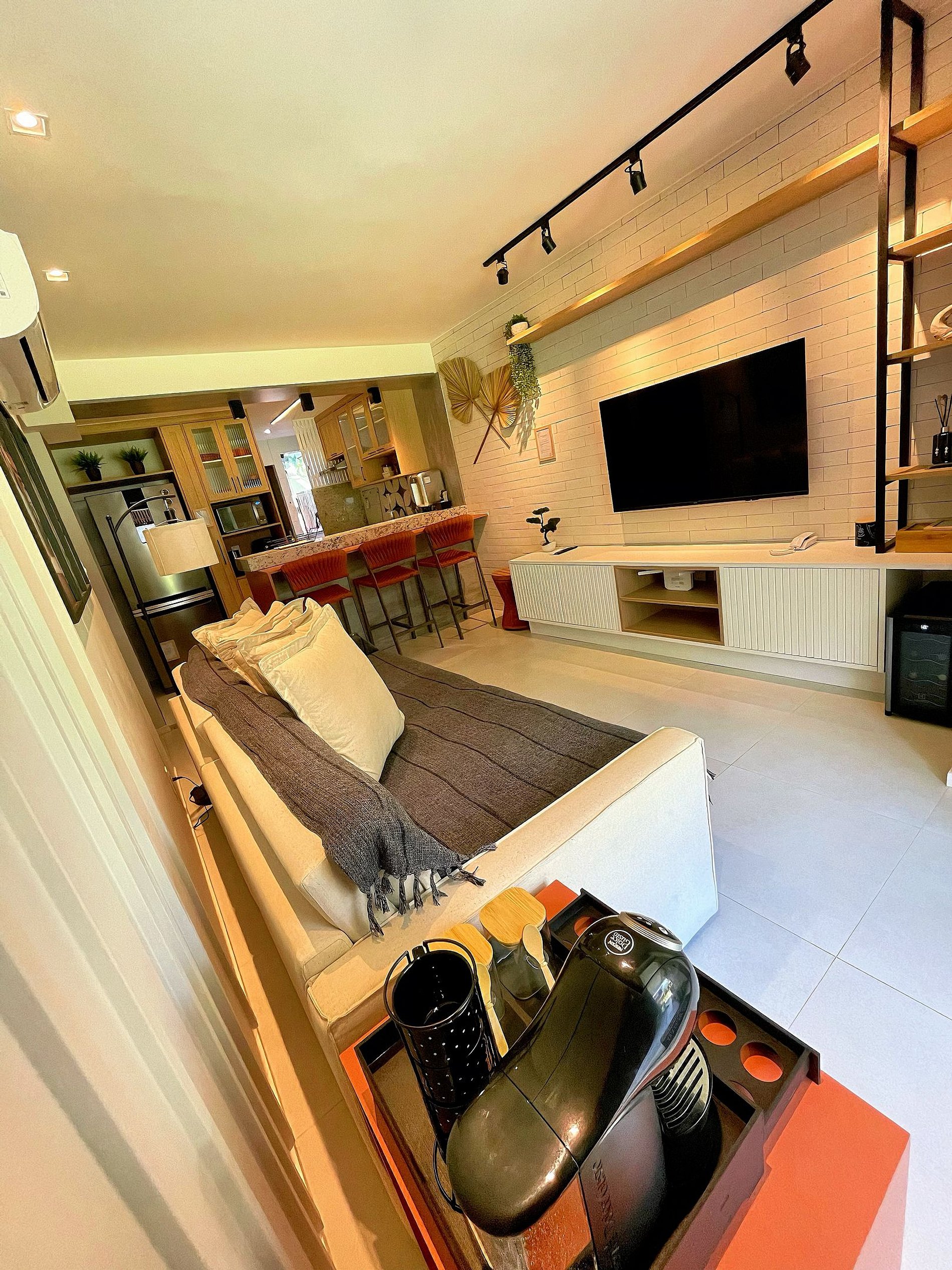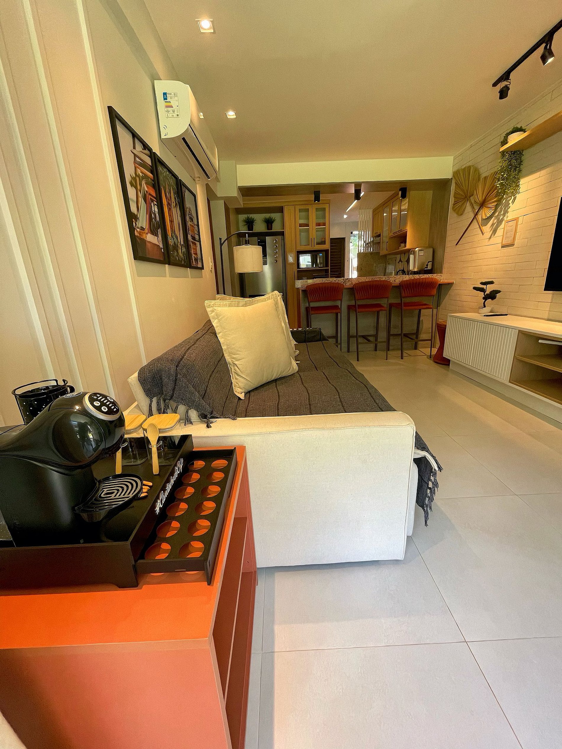 Sala: 1 sofá cama para casal, condicionado split, cortina e smart tv 55” com a Netflix e Prime vídeo, e outros streams, Adega. Bancada de cozinha americana, com 3 banquetas.