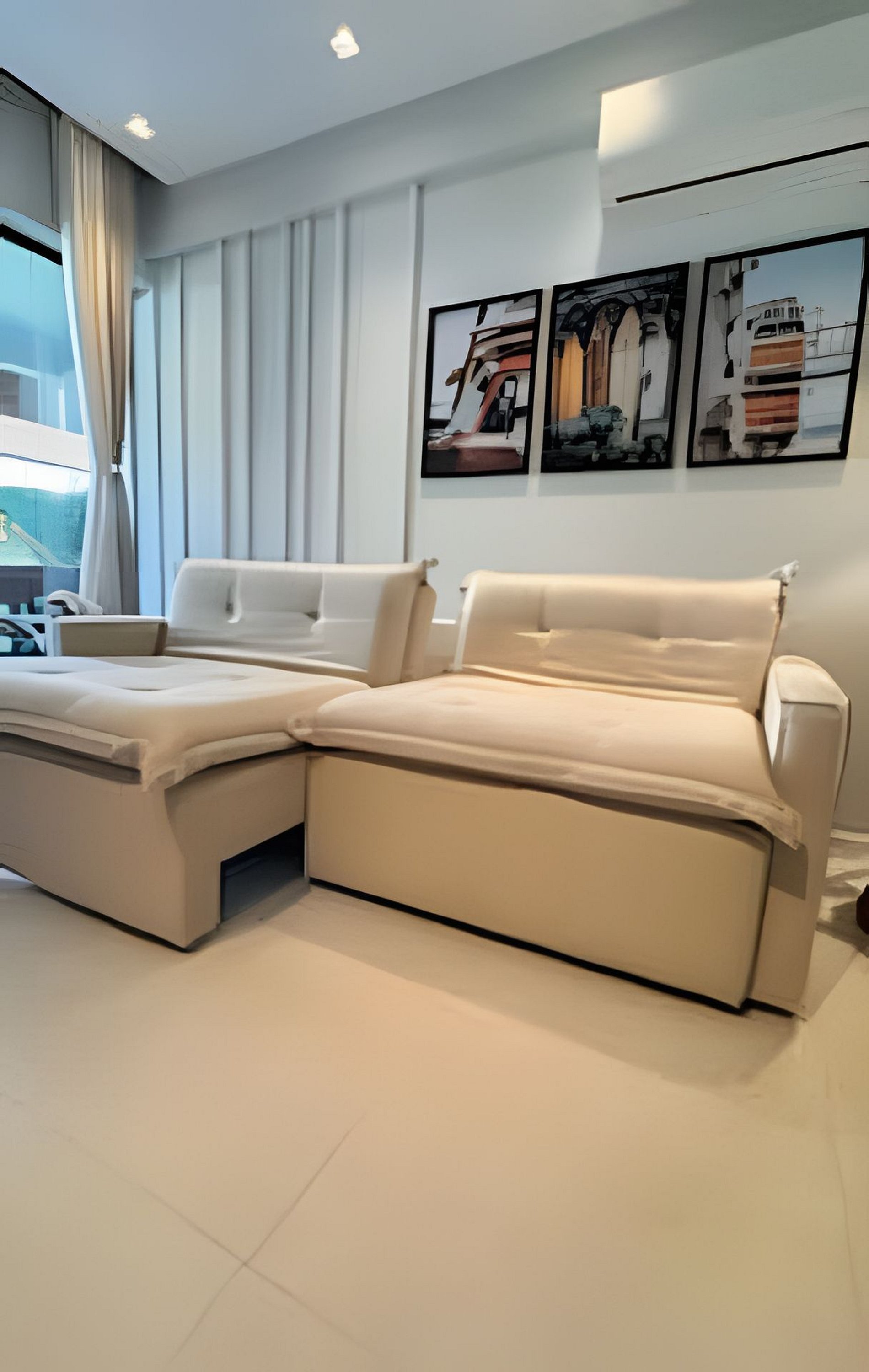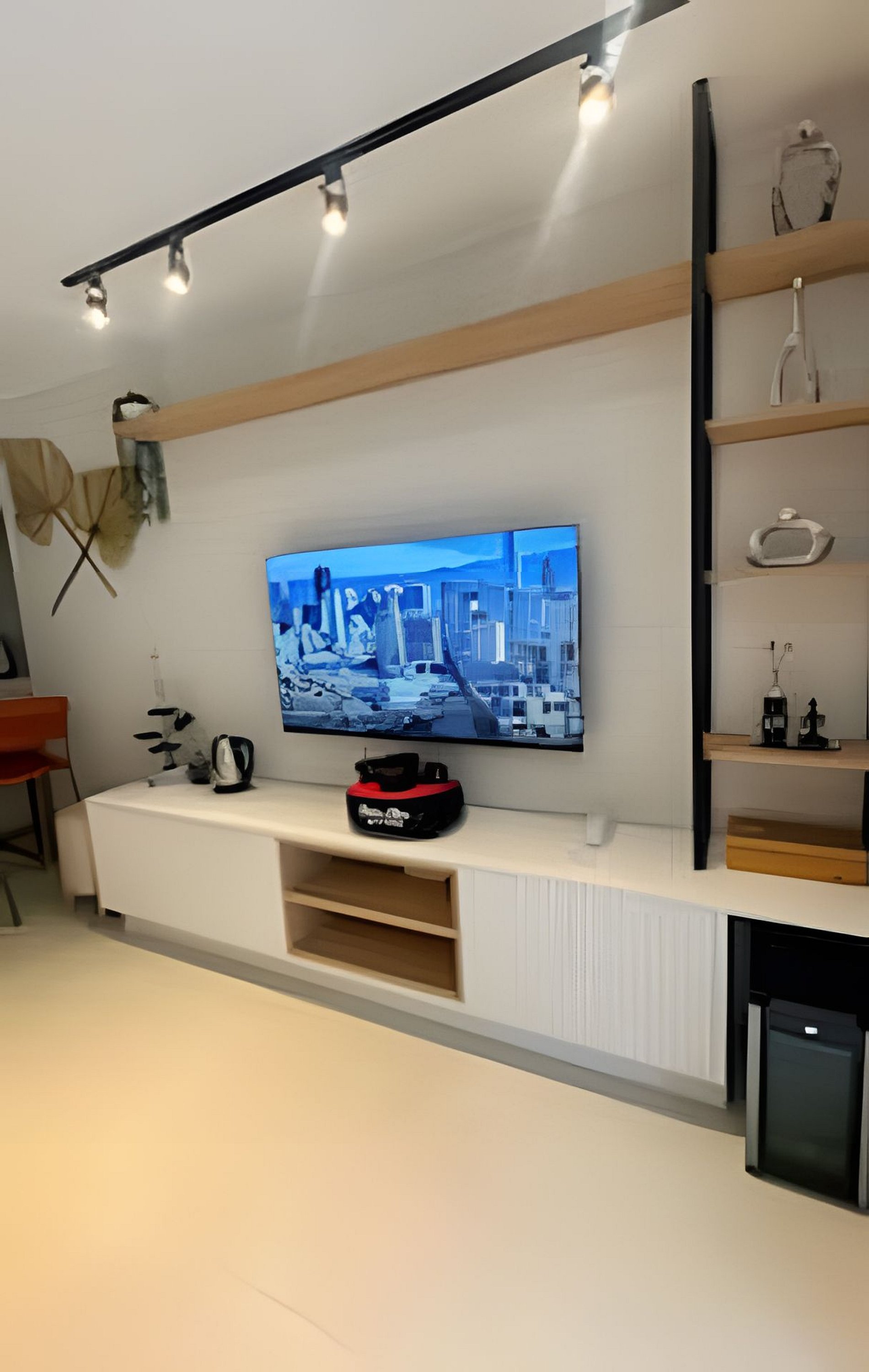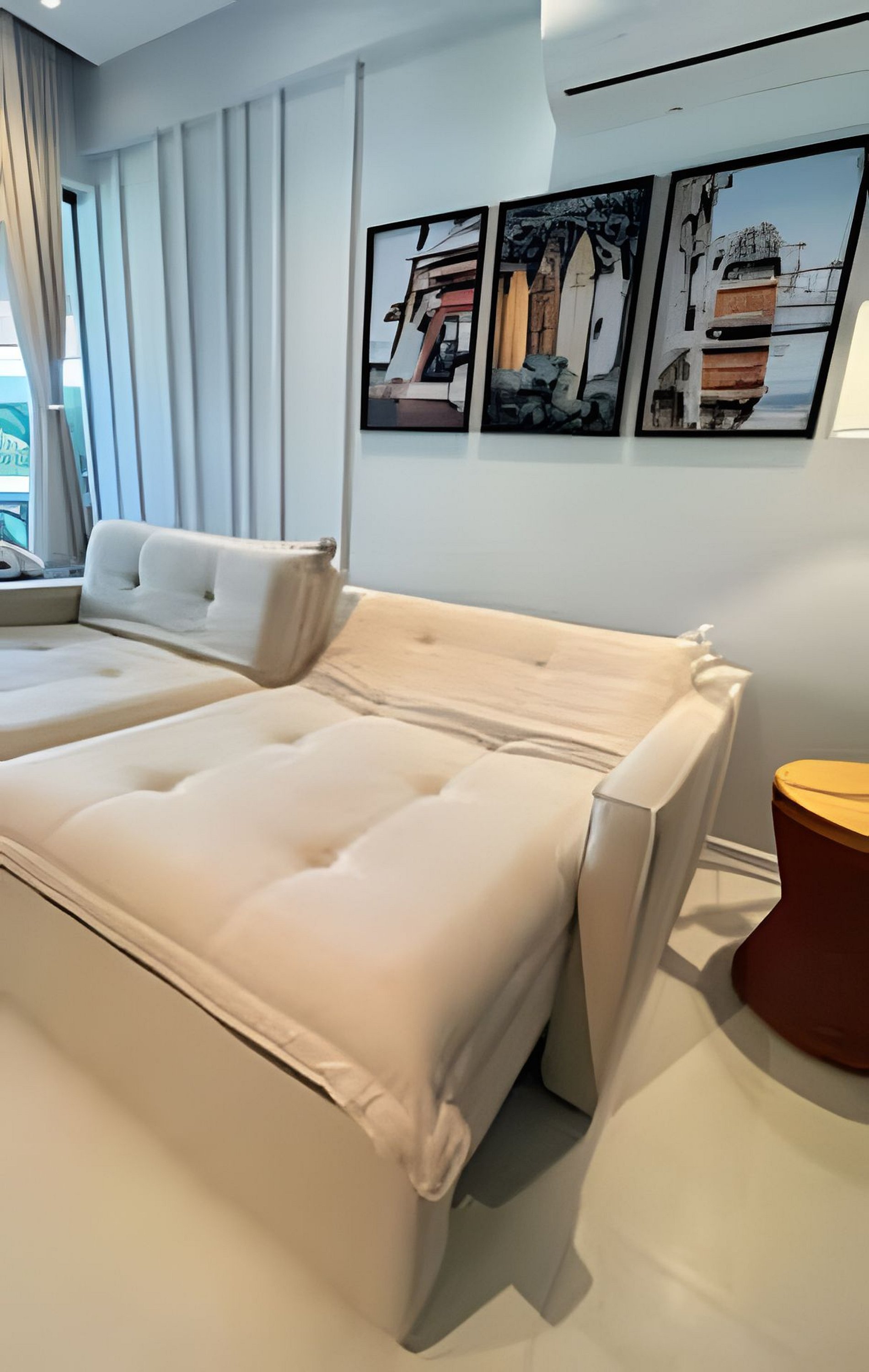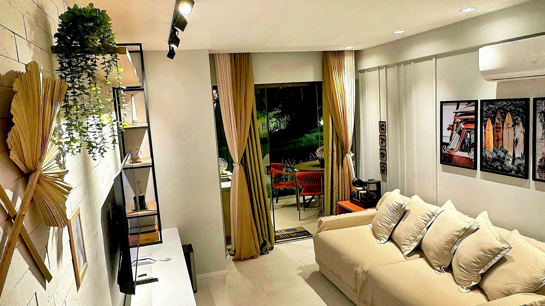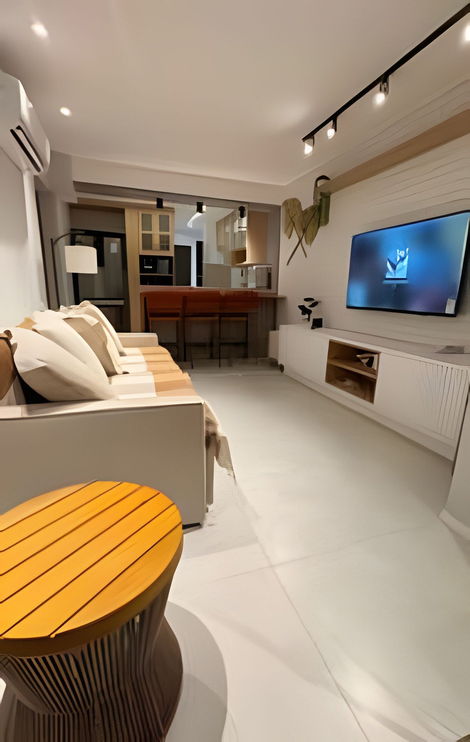 Sala: 1 sofá cama para casal, condicionado split, cortina e smart tv 55” com a Netflix e Prime vídeo, e outros streams, Adega. Bancada de cozinha americana, com 3 banquetas.
