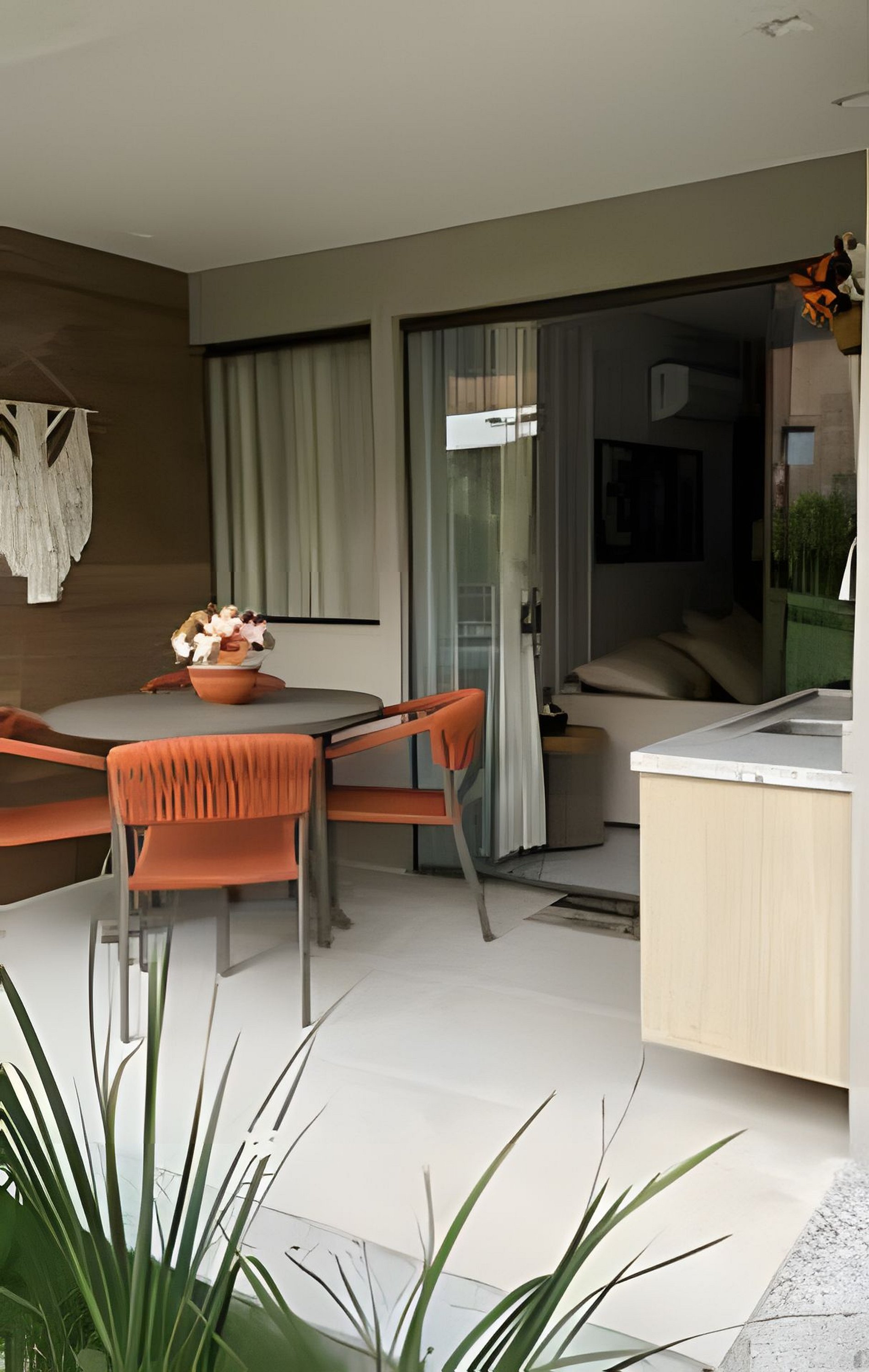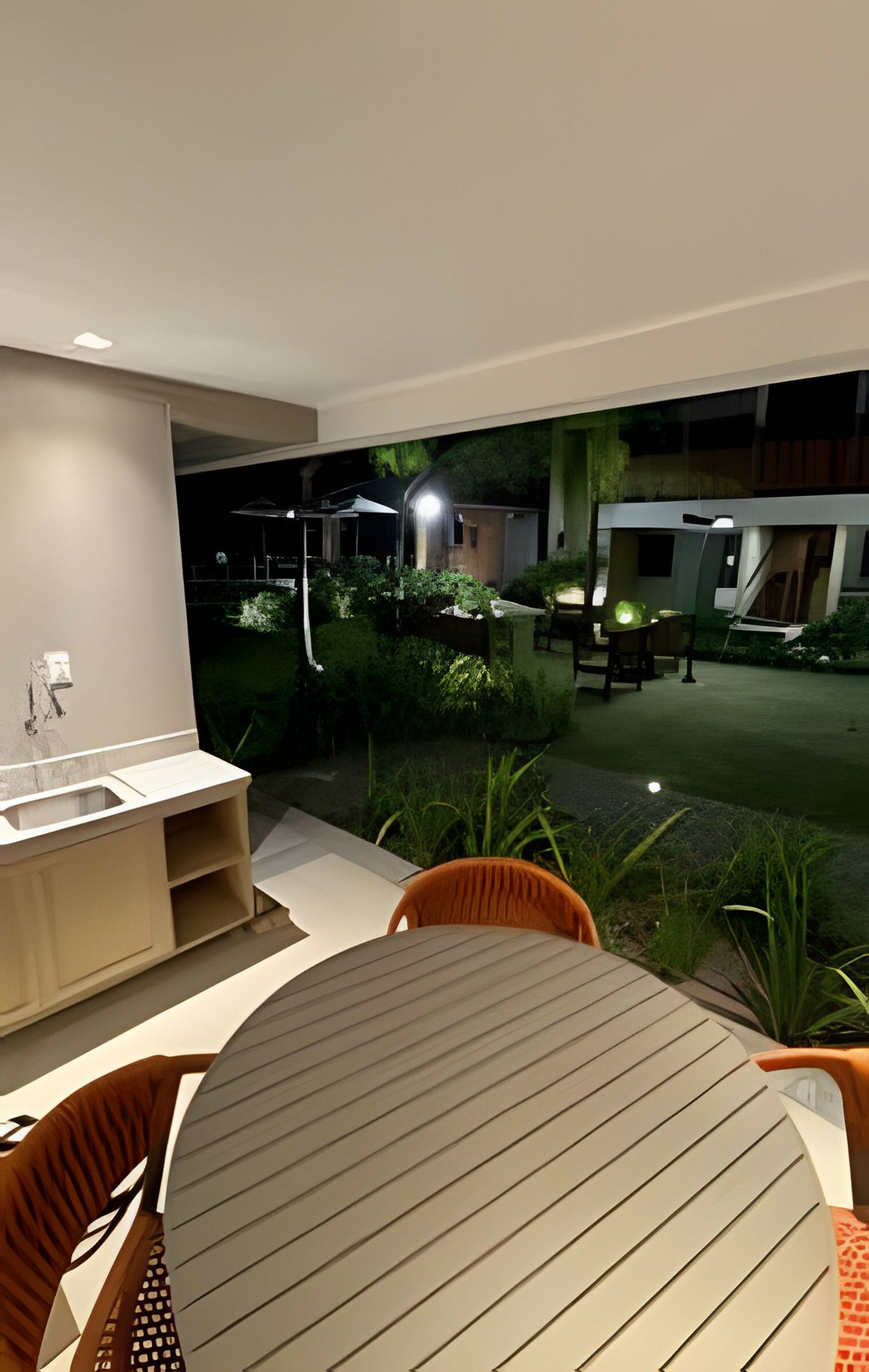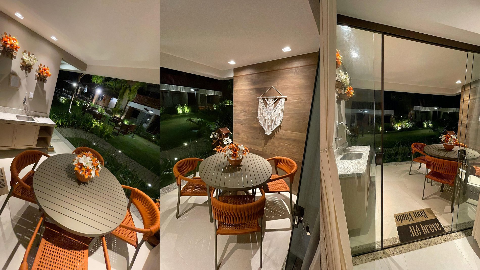 Na varanda temos uma mesa com 4 cadeiras super confortáveis, pia e uma vista pro jardim e Piscina do Tiê Residencial.