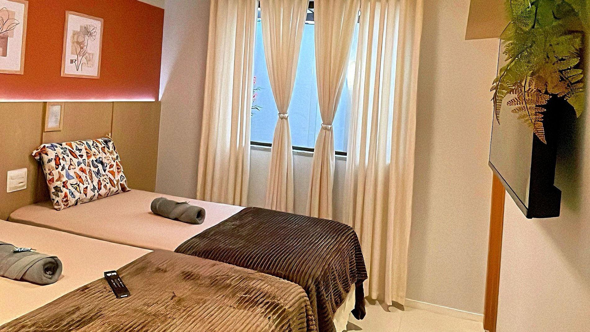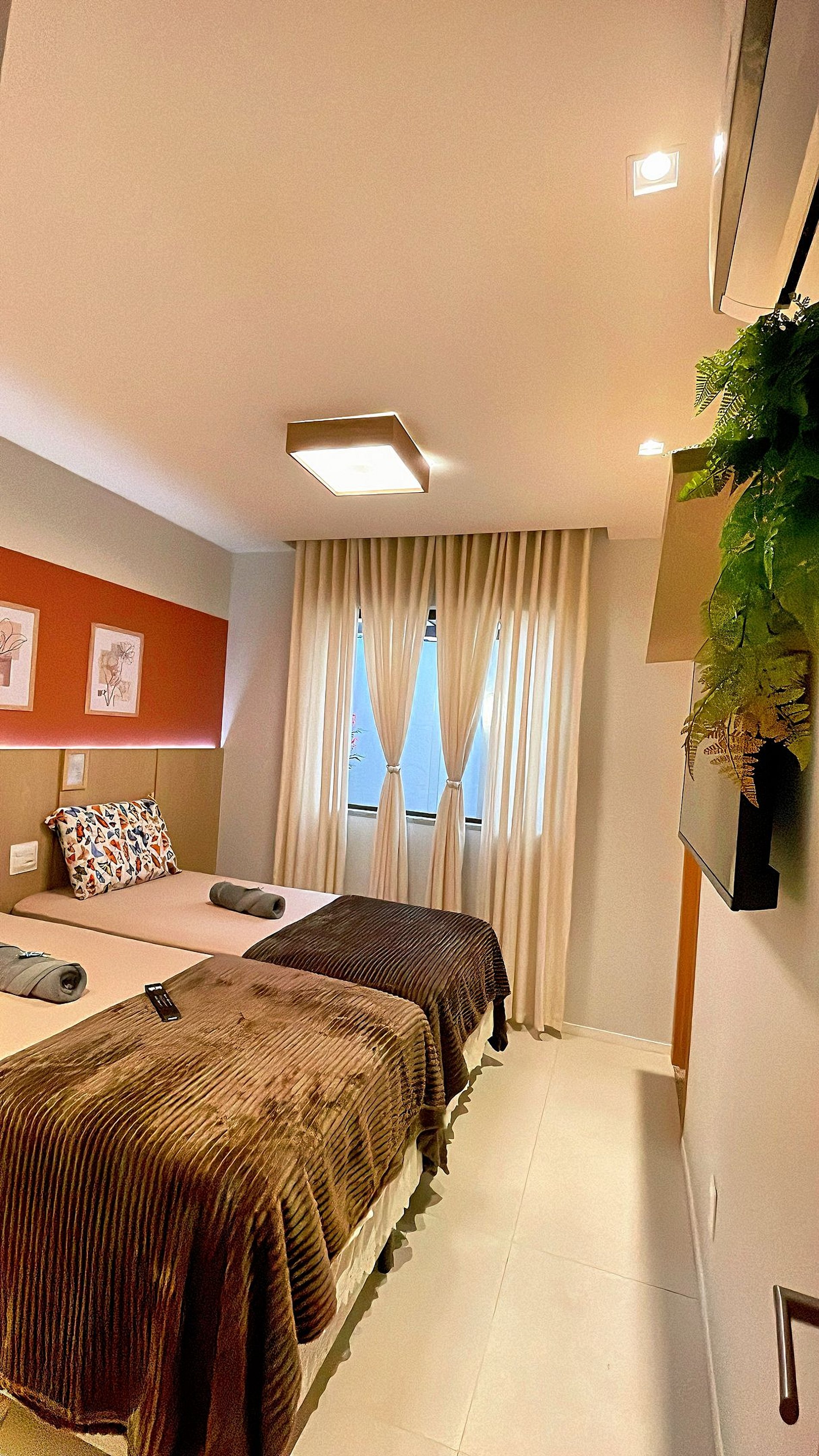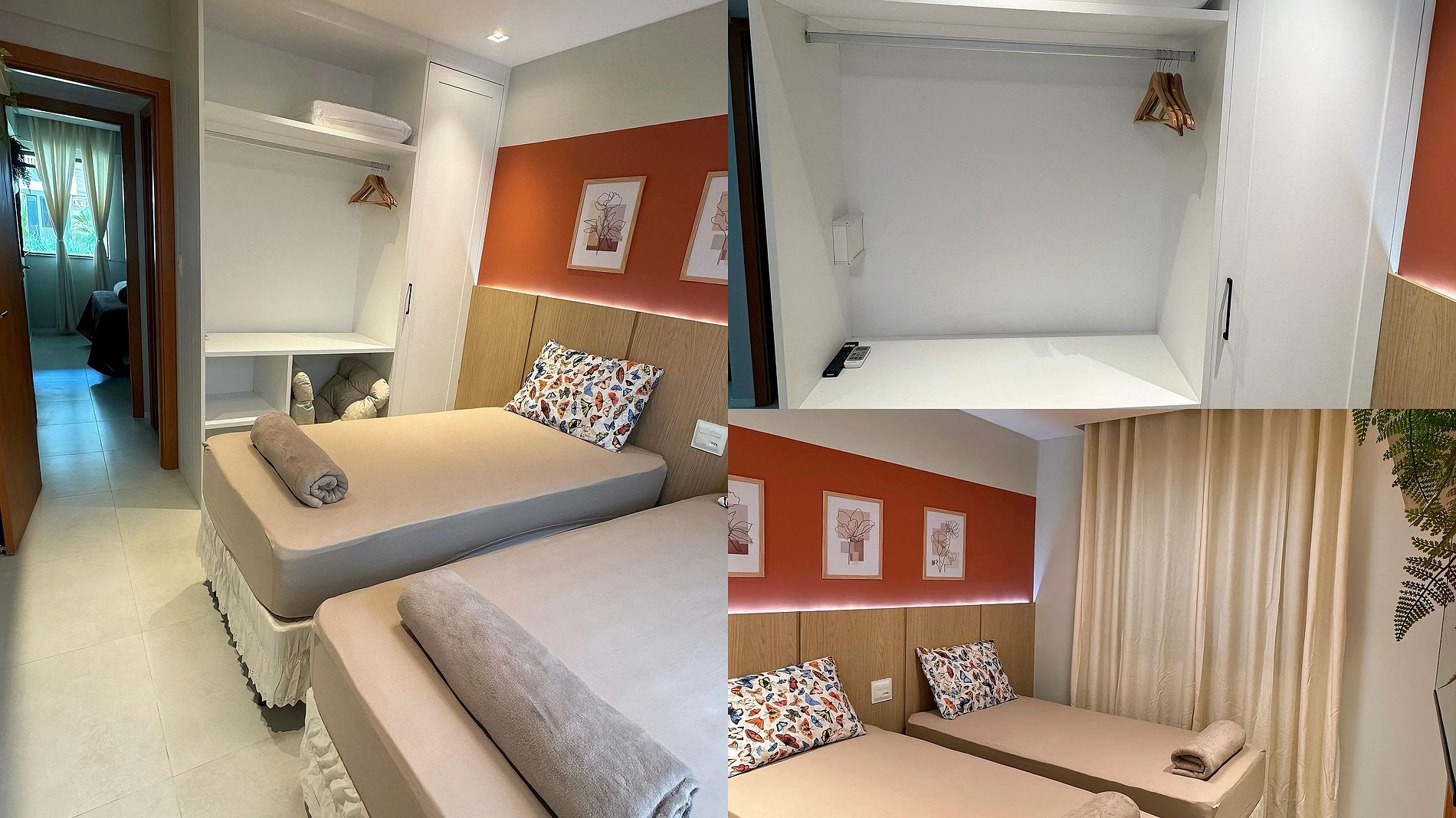 Suíte 2: 2 camas de solteiro com um auxiliar embaixo, podendo juntar e virar uma cama King., ar condicionado split, cortina e smart tv 43” com Netflix e Prime vídeo, e outros streams, travesseiros, e banheiro privativo.